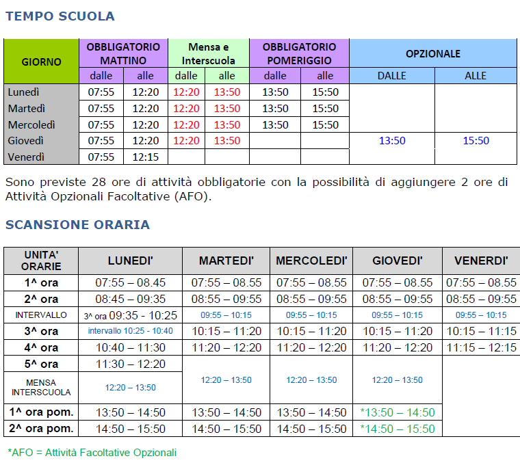 Le famiglie possono scegliere di iscrivere i figli alle Attività Facoltative Opzionali programmate nel pomeriggio del GIOVEDI’ dalle ore 13.50 alle ore 15.50.